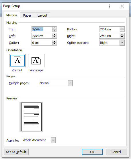 مقدار پیش‌فرض برای «Gutter» صفر است. بدون آنکه توضیح دهم، مقدار آن را افزایش دهید و به تغییر در تصویر پایین همین کادر، زیر «Preview» توجه کنید. این عدد مقداری را نشان می‌دهد که برای عملیات شیرازه‌بندی لازم است. در مقابل همین مستطیل، «Gutter Position» را می‌بینید و در کنار آن مستطیلی که می‌توان محل این شیرازه‌بندی را انتخاب کرد (راست، چپ یا بالا). بهتر است مقدار «Gutter» همان صفر باقی بماند.