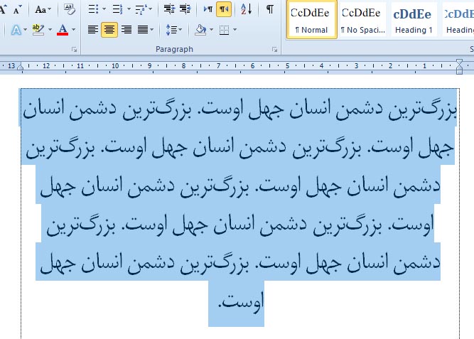 اما روش دیگر: مطلبی را با فونت پیش‌فرض بنویسید. سپس تنظیمات پاراگراف مورد علاقه را بر روی آن اعمال کنید؛ تنظیماتی از قبیل راست‌چین، وسط‌چین و یا تراز از دوطرف، فاصلۀ خطوط پاراگراف، فاصله از پاراگراف قبل و بعد، و نظایر اینها. امیدوارم در جلسات بعد، در صورت پرسش شما، به این تنظیمات نیز بپردازم.