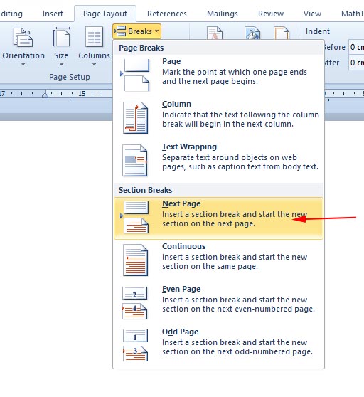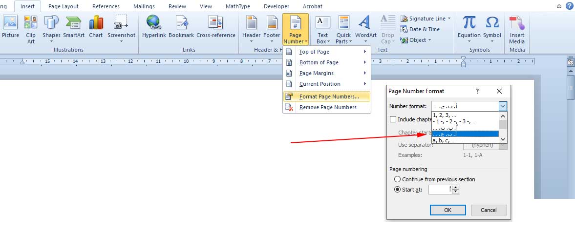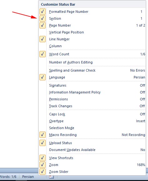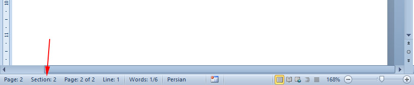 برای آنکه در یک سند چند صفحه‌ای، شماره صفحات با فرمت متفاوت داشته باشید، باید ابتدا سند را به دو (یا چند) بخش (Section) تقسیم کنید. معمولاً هنگام نگارش پایان‌نامه، از شما می‌خواهند که صفحات تا بعد از مقدمه، به صورت حروف ابجد شماره‌گذاری شود، اما شمارۀ صفحات در متن اصلی به صورت عددی باشد. در اینجا همین شیوه را آموزش می‌دهم، هرچند پس از فراگیری، می‌توانید روش‌های دیگر را نیز تجربه کنید.
