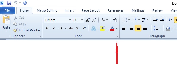 از سربرگ Home، بر روی علامت فلش کوچک که در گوشۀ سمت راست پایین کادر Font قرار دارد کلیک کنید (تصویر زیر را ببینید).