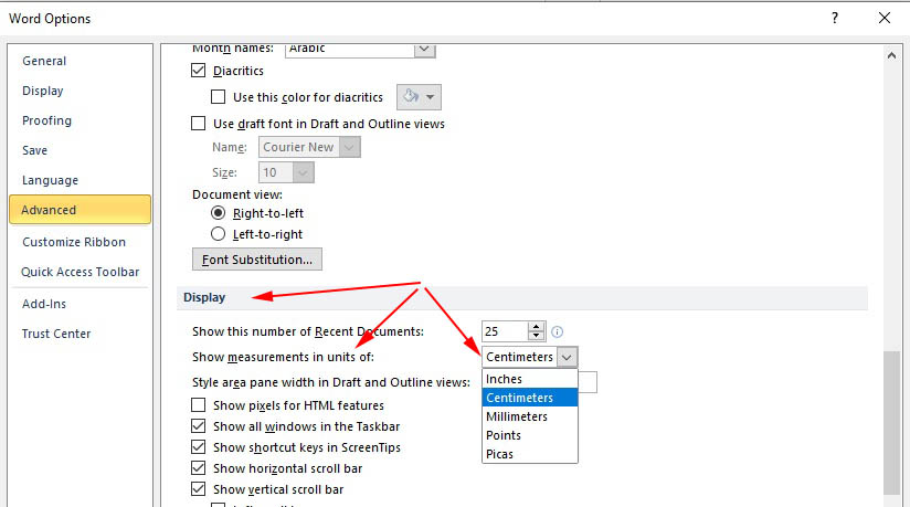 در دومین خط زیر «Display» عبارت «Show measurements in units of» را می‌بینید که در مقابل آن مستطیلی قرار دارد و در آن، واحد اندازه‌گیری نمایش داده شده است. اگر سانتیمتر نیست، روی فلش کنار مستطیل کلیک کنید و در کادری که باز می‌شود، «Centimeters» را انتخاب کنید.