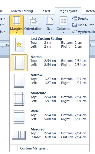 در سربرگ «Page Layout» بر روی فلش زیر «Margins» کلیک کنید.