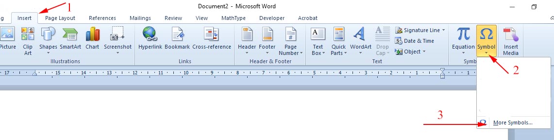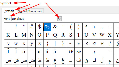 1. در سربرگ Insert و در انتهای سمت راست آن، بر روی فلش زیر Symbol کلیک کنید و More Symbols را انتخاب نمایید. کادر محاوره‌ای Symbol باز می‌شود.