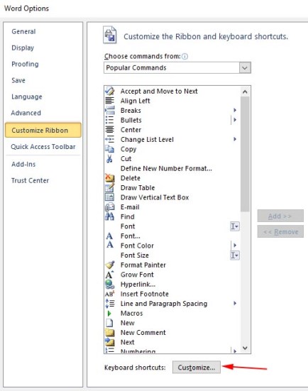 3. در پایین همین کادر، روی گزینۀ «Shortcut Key» کلیک کنید تا کادر محاوره‌ای «Customise Keyboard» باز شود.