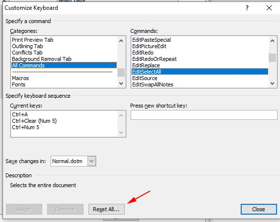 2. سپس در پایین همین کادر، گزینه «Assign» را کلیک کنید. با این کار، میانبری که تعریف کرده‌اید در مستطیل «Current keys» قرار می‌گیرد. (قبل از رفتن به مرحله بعد می‌توانید به همین ترتیب میانبرهای دیگری را نیز برای همین نویسه تعریف کنید. پس از تعریف میانبر جدید در مستطیل «Press New Shortcut Key»، گزینه «Assign» را کلیک کنید تا میانبر جدید به میانبرهای موجود در مستطیل «Current keys» اضافه شود.)