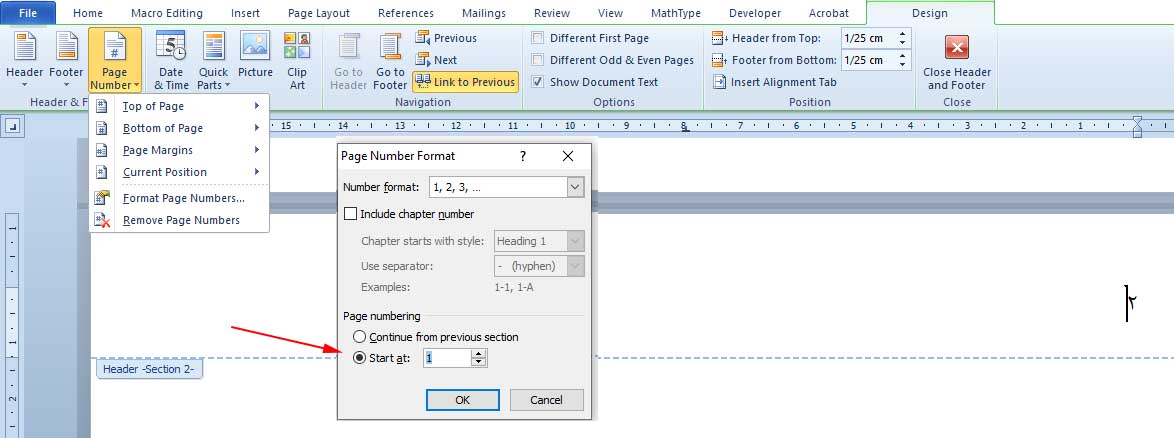در مستطیل مقابل «Start at» می‌توانید مشخص کنید که شماره پاورقی از چه عددی شروع شود. معمولاً بهتر است تنظیمات پیش‌فرض را دست نزنید.