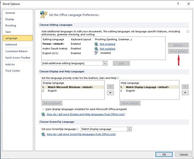 1. زبان مورد علاقه خود را که مایلید ورد با آن زبان باز شود (مثلاً فارسی)، در ویندوز نصب کنید. (امیدوارم که این کار را بلد باشید!)