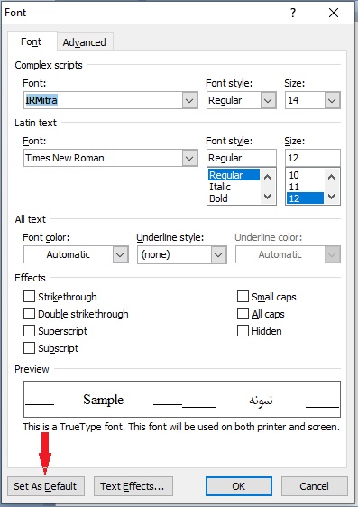 صفحه Font باز می‌شود. در مستطیل تحت عنوان Complex scripts نام فونت فارسیِ مورد علاقه را انتخاب کرده، در مستطیل‌های کنار آن، عبارت Regular و سپس اندازه فونت را انتخاب کنید (در تصویر، فونت IRmitra با اندازه 14 انتخاب شده است). در مستطیل‌های زیر عنوان Latin Text مراحل بالا را برای انتخاب فونت مورد علاقه انگلیسی تکرار کنید. می‌توانید از همان فونت استاندارد IRmitra استفاده کنید (در فونت‌های استاندارد، حروف انگلیسی نیز پیش‌بینی شده است). اما اگر فونت‌های دیگر مانند Times New Roman را انتخاب کردید، بهتر است اندازۀ آن یکی دو شماره کمتر از فونت فارسی باشد. (تصویر را ببینید.)