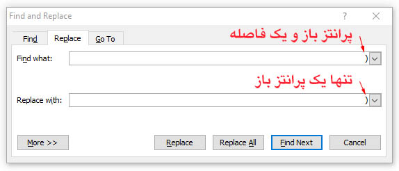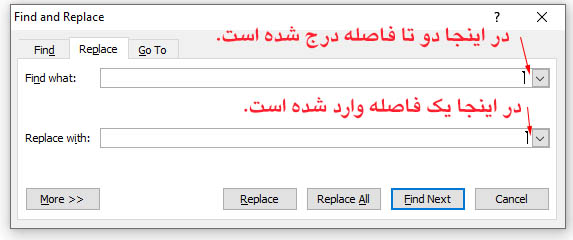 ب) قبل از هر کاری، باید فواصل اضافی در جاهایی که دو یا چند فاصله پشت سر هم قرار دارد، حذف شود. برای این کار در مستطیل جستجو کلیک کرده، دو بار کلید «Space» را روی صفحه کلید فشار دهید. معمولاً تنها چیزی که متوجه می‌شوید آن است که با هربار کلیک، مکان نما جابه‌جا می‌شود. سپس در مستطیل جایگزینی کلیک کرده، کلید «Space» را تنها یک بار فشار دهید. حال گزینۀ «Replace All» را آنقدر کلیک کنید تا دیگر هیچ جایگزینی صورت نگیرد و عدد صفر به عنوان تعداد جایگزین نمایش داده شود. (در این متن به دلیل آنکه در جایی سه فاصله پشت سر هم قرار دارد، باید دو بار این گزینه را کلیک کنید تا تمام فاصله‌های اضافی حذف شود).