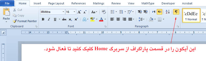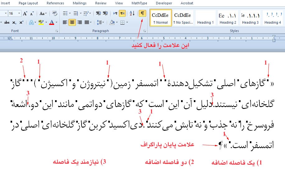 در متن بالا، فاصله رعایت نشده است. برای اینکه بهتر بتوانید مشکلات متن را ببینید، بهتر است نویسه‌های نامرئی مانند فاصله (Space) و نظایر آن نشان داده شود. برای این کار آیکونی را که به شکل علامت P معکوس است در قسمت «Paragraph» از سربرگ «Home» فعال کنید: