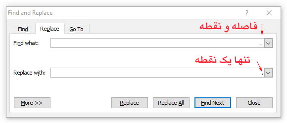 4- در مواردی که باید بعد از علامت سجاوندی یک فاصله باشد (بعد از نقطه، ویرگول، گیومۀ بسته و نظایر آن‌ها)، در مستطیل جستجو، علامت سجاوندی را وارد کنید و سپس در مستطیل جایگزینی، ابتدا همان علامت را وارد کرده، سپس یک بار کلید «Space» را فشار دهید. در نهایت گزینه «Replace All» را کلیک کنید.